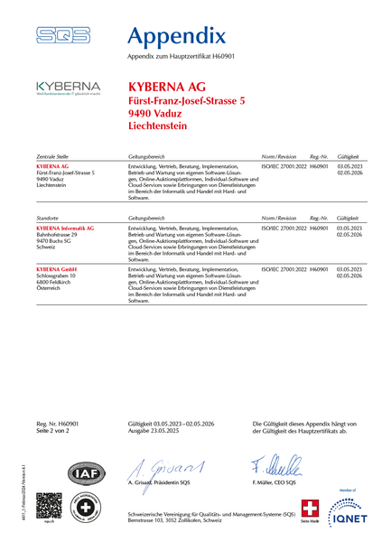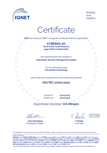 Das Zertifikat bestätigt, dass die KYBERNA AG ein starkes Bewusstsein für IT und Cyber-Risiken besitzt. So erfüllen das gesamte Unternehmen sowie alle drei Hauptprodukte ky2help®, ky4workplace und eAuktion die geforderten Normen. Wir streben alle umzusetzenden und zu verwendenden Sicherheitsmassnahmen an, als auch dass wir zukünftig alle Anforderungen der internationalen Norm erfüllen.