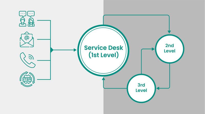 Der Service Desk nimmt alle Anfragen entgegen und versucht diese, direkt zu lösen. Sofern er nicht in der Lage ist, diese Anfragen direkt zu lösen – aufgrund von Klumpen-Anfragen oder Kapazitätsengpässen – werden diese eskaliert. Hierbei spricht man von einer funktionalen Eskalation in den 2nd Level Support. Der 2nd Level besteht aus verschiedenen Spezialisten-Teams, die diese Anfragen dann mit mehr Fachkompetenz lösen. Dies sind die altbewährten Netzwerk- oder System Administratoren, die in Organisationen existieren.