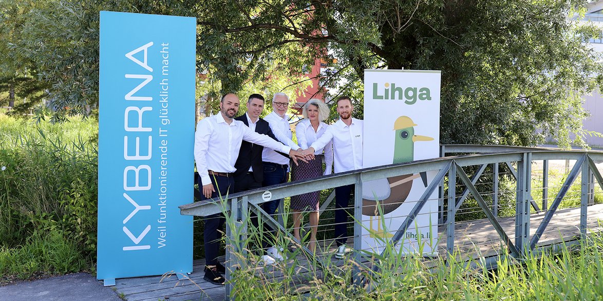 Auf eine erfolgreiche Zusammenarbeit v.l.n.r.: David Cohen und Alexander Zorn (beide KYBERNA), Georges Lüchinger (LIHGA), Jacqueline Frei (KYBERNA) und Sandro Wolfinger (LIHGA) freuen sich auf das Jubiläumsjahr 2026.