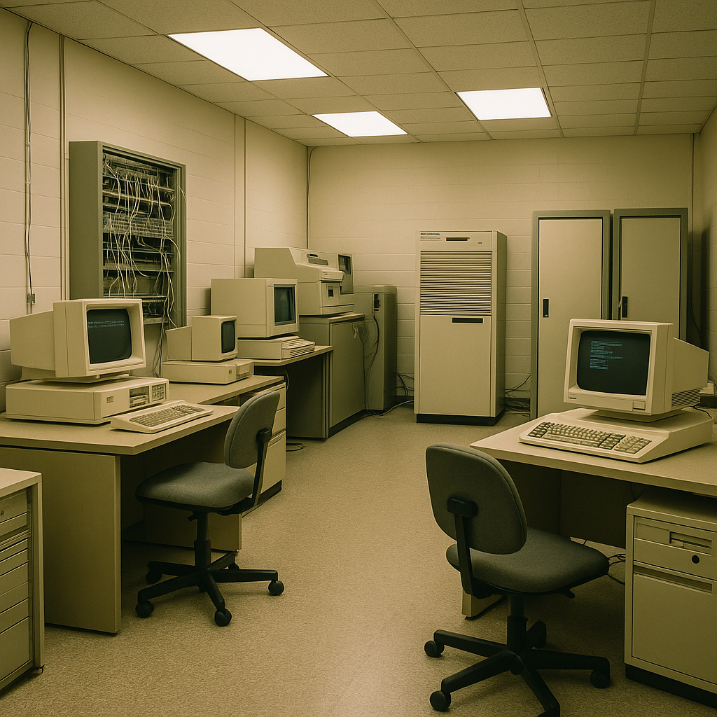Visualisierung einer IT-Infrastruktur aus dem Jahr 1986 (KI-generiert).
